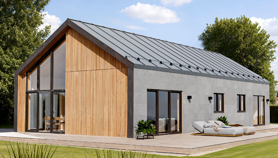 • Finitions extérieures : bardage peint en 3 couches, bardeaux bitumés, enduit, béton texturé ou bac acier.